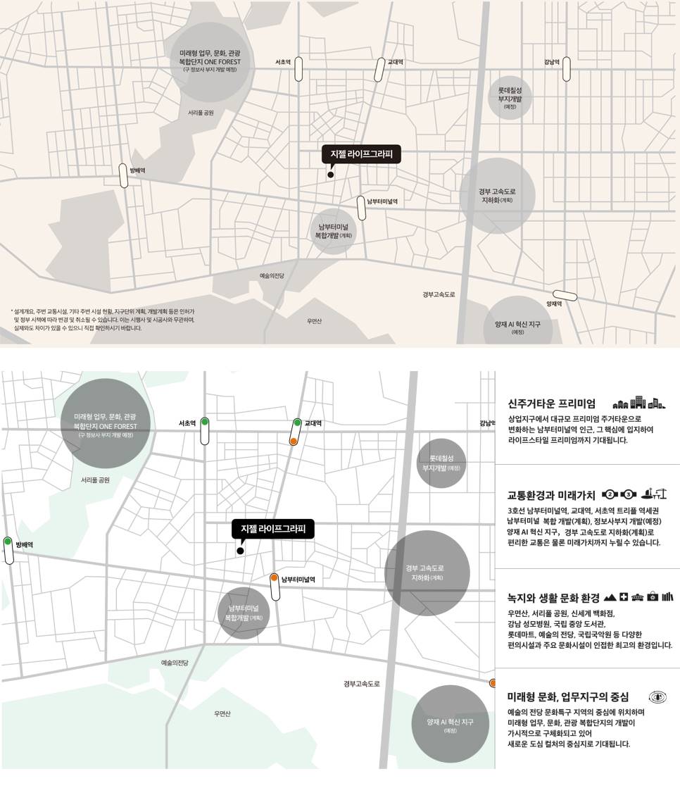 서초동의 중심에서 누리는 하이엔드 라이프 강남의 비전과 서초의 품격이 만나는 독보적 입지 가치 교대역, 남부터미널역, 서초역을 잇는 트리플 역세권의 중심에서 강남권의 풍부한 인프라와 프리미엄 생활권을 동시에 소유할 수 있습니다. 차원이 다른 고품격 커뮤니티 공간 피트니스부터 멤버십 라운지까지 입주민을 위한 특화 시설 삶의 질을 높여주는 고품격 커뮤니티 시설을 통해 도심 속에서도 품격 있는 휴식과 여유로운 라이프스타일을 제안합니다. 감각적인 디자인의 특화 설계 개방감을 극대화한 2면 개방 구조와 호텔급 인테리어 LDK 구조의 혁신적인 평면 설계를 도입하여 더 넓고 쾌적한 주거 공간과 세련된 인테리어 미학을 완성했습니다. 생활의 편리함을 더하는 컨시어지 서비스 일상의 가치를 높여주는 전문적인 주거 케어 솔루션 청소, 세탁 등 다양한 맞춤형 컨시어지 서비스를 제공하여 바쁜 현대인을 위한 스마트하고 편리한 주거 환경을 구축했습니다. 풍부한 녹지와 문화가 공존하는 환경 서리풀공원과 예술의전당을 곁에 둔 힐링 인프라 대규모 녹지 공간인 서리풀공원과 대한민국 문화의 중심 예술의전당이 인접하여 자연과 문화가 어우러진 최상의 주거 쾌적성을 자랑합니다. 압도적인 미래 가치와 배후 수요 정보사 부지 개발 및 서초로 지구단위계획의 직접적 수혜 주변 대규모 개발 호재를 통한 높은 미래 비전은 물론 법조타운과 강남 업무지구의 탄탄한 배후 수요를 확보한 안정적 자산입니다.